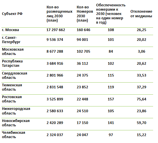 Банк ДОМ.РФ спрогнозировал, как изменится обеспеченность регионов России гостиничными номерами с учетом строительства новых объектов туристической инфраструктуры, в том числе за счет льготной программы Минэкономразвития РФ. Обеспеченность номерным фондом означает количество лиц на один номер. Этот показатель сравнивается с медианным показателем по стране. Положительное отклонение от медианы для конкретного региона означает, что обеспеченность номерным фондом в данном регионе ниже медианной по России. Совокупный прогнозируемы прирост номерного фонда по всей России составит 399,8 тыс. номеров, в том числе 78,7 тыс. номеров за счет льготной программы финансирования. Самый большой прогнозируемый абсолютный прирост номерного фонда к 2030 году демонстрирует Краснодарский край – 55 532 номера, в том числе 12 344 номера за счет льготной программы. Вторым регионом с самым большим прогнозируемым приростом стал город Москва – 53 749 номеров, в том числе 6 142 номера за счет льготной программы. Однако уровень обеспеченности номерным фондом в Москве к 2030 году свидетельствует о будущем недостатке предложения по сравнению с медианным показателем по России. Так, согласно расчетам, на один номер претендуют 108 человек в год. Наиболее необеспеченные номерным фондом регионы – Республика Адыгея (229 человек на номер), Ростовская область (157 человек), Омская область (154 человека), Амурская область (148 человек). При этом отмечается высокий потенциал развития туризма за счет горнолыжного отдыха и внутреннего спроса в таких регионах, как Свердловская, Тюменская, Новосибирская и Челябинская области. «Обеспеченность регионов качественным гостиничным фондом для развития внутреннего туризма – одна из задач, которую решает программа льготного финансирования туристической инфраструктуры. С ее применением сейчас в стране строится более 78 700 гостиничных номеров, в том числе около 11 500 финансируется Банком ДОМ.РФ. Среди регионов-лидеров, которые активно используют возможности программы, можно назвать Краснодарский край. Согласно нашим расчетам, этот регион имеет самый высокий показатель обеспеченности гостиничными номерами к 2030 году, что говорит о высокой сезонности Краснодарского края и о насыщении региона номерным фондом», – прокомментировала директор подразделения «Туризм» Банка ДОМ.РФ Анна Маликова. Методика расчета: На основании исследования краткосрочных и долгосрочных трендов прироста турпотока и номерного фонда в стране было спрогнозировано плановое количество размещенных лиц в 2030 году и количество гостиничных номеров к 2030 с учетом прироста за счет льготной программы финансирования туризма. Рассчитаны показатели обеспеченности номерным фондом в 2024 году и плановые к 2030 году. Обеспеченность номерным фондом рассчитывается как результат деления количества размещенных лиц на номерной фонд – означает количество лиц на один номер. Регионы с наибольшем количеством размещенных лиц и положительном отклонением от медианы