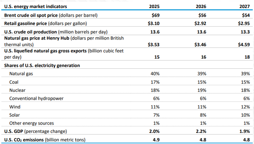 Касаемо прогноза по цене на нефть EIA написал, что мы ожидаем, что цены на нефть снизятся в 2026 г., поскольку мировое производство нефти превысит мировой спрос, что приведет к росту запасов нефти. Мировые запасы продолжат расти и в 2027 г., хотя и более медленными темпами. Мы прогнозируем, что средняя цена на нефть марки Brent составит $56/б в 2026 г., что на 19% меньше, чем в 2025 г., а затем в среднем $54/б в 2027 г.
