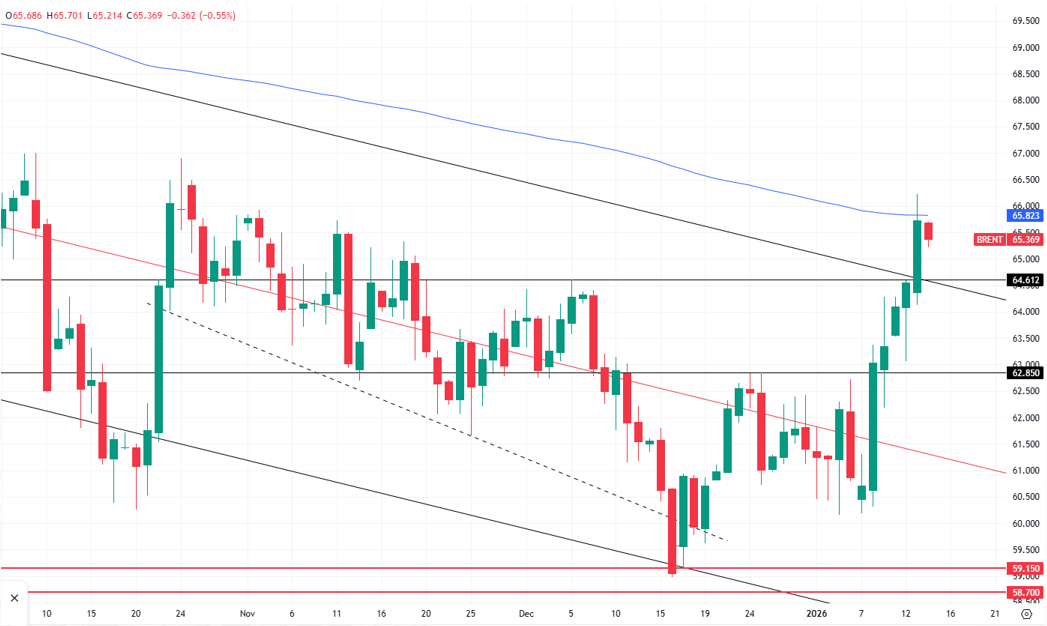 Технически цена на нефть достигла отметки $65,8/б, где находится 200-ая скользящая средняя. Вместе с тем, перспектива пробоя пока что остаётся под большим вопросом. В сценарии пробоя (что возможно, например, на фоне геополитики) целью быков может вначале стать отметка $68,3/б. Пробой будет означать слом краткосрочного, но не среднесрочного тренда. В сценарии отскока вероятен возврат к уровню $64,6/б.