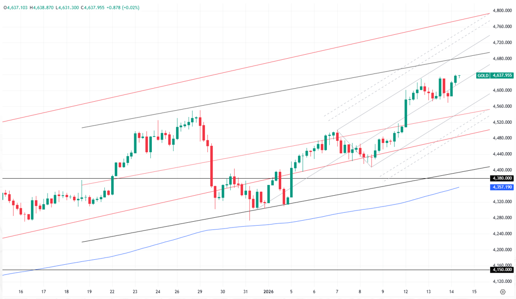 Цена на золото пытается закрепиться выше $4600 за тройскую унцию На вчерашних торгах цена на золото незначительно снизилась на 0,3%. На торговой сессии в среду рост возобновился и к настоящему времени цена находится вблизи отметки $4635 за тройскую унцию. Bloomberg провёл опрос среди управляющих активами и оценил настроение большинства из них как позитивные. Управляющие по-прежнему предпочитают сохранять длинные позиции в золоте, не ожидая существенной коррекции цен на металл. В качестве факторов роста опрашиваемые назвали атаку на независимость центрального банка в США, а также высокий уровень внешнего долга. Citigroup тем временем повысили свои оценки по цене на золото и на серебро. Прогноз по золоту на ближайший квартал составляет $5000 за тройскую унцию vs. $4200 ранее. Прогноз по серебру - $100 за унцию vs. $62 за унцию ранее. Банк считает, что дефицит физического серебра и металлов платиновой группы может усилиться в краткосрочной перспективе из-за возможной отсрочки решения по тарифам со стороны Белого дома, вместе с тем, в дальнейшем, как пишет Bloomberg, геополитические риски начнут снижаться, а вслед за этим начнут снижаться и цены на драгоценные металлы. Технически, как мы и ожидали, произошёл небольшой откат. Мы полагали, что цена опустится до отметки $4550, однако медведям удалось только достичь уровня $4570 за тройскую унцию, после чего рост возобновился. На 4-х часовом ТФ целью быков становится локальная отметка на уровне $4680 за тройскую унцию.