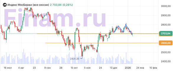 Вечером в среду, 14 января, российский рынок умеренно вырос: Индекс МосБиржи вернулся выше 2700 пунктов (+0,3%), несмотря на утреннее снижение и сохраняющуюся геополитическую неопределенность. Инвесторы реагируют на сообщения западных СМИ о подготовке нового этапа переговоров по украинскому урегулированию: по данным Bloomberg, спецпосланник президента США Стив Уиткофф и зять американского лидера Джаред Кушнер в ближайшее время могут посетить Москву для встречи с Владимиром Путиным. Эта новость, а также поддержка от восстановившейся нефти (Brent снова выше $66), стали стимулом для покупок в середине дня. Поводом для оптимизма в первой половине дня стали сообщения о возможном прогрессе на дипломатическом фронте: в США обсуждается вариант быстрого согласования мирного соглашения по Украине, однако конкретных решений пока не последовало. Противоречия между сторонами по ключевым вопросам сохраняются, и, по оценкам западных наблюдателей, на согласование деталей может уйти еще немало времени. Российские официальные лица также подчеркивают курс на достижение устойчивого и долгосрочного мира только на базе полноценных подписанных соглашений. На фоне сохраняющихся санкционных рисков и осторожности в нефтегазе, общий оптимизм рынка сдерживается ожиданием новых решений по западным ограничениям и судьбе иностранных активов «ЛУКОЙЛа». Геополитика по-прежнему оказывает ключевое влияние: ЕС готовит новый санкционный пакет, а в США и Европе обсуждаются дополнительные меры в адрес России, однако локальные инвесторы реагируют на эти новости менее остро, чем раньше. Нефть после утренней коррекции вновь растет: рынок продолжает оценивать риски перебоев с поставками из Ирана и внимательно следит за развитием ситуации на Ближнем Востоке на фоне угроз ужесточения конфликта. Это поддерживает спрос на российские нефтегазовые активы даже несмотря на данные о росте запасов нефти в США. Цена за баррель нефти марки Brent растет до 66,2$ (+1,1%). Лидеры роста сегодня: «Селигдар» (+4,04%), «Магнит» (+3,67%), «Мечел» а.п. (+3,09%), ЛСР (+2,72%), «Татнефть» (+2,38%), «Россети Центр и Приволжья» (+2,18%), МТС (+2,12%), «Транснефть» привилегированные (+1,94%), «Мечел» (+1,89%), «Татнефть» привилегированные (+1,79%). Хуже рынка торговались: Вуш Холдинг (–1,68%), НМТП (–1,39%), «Сургутнефтегаз» привилегированные (–0,97%), «Фармсинтез» (–0,92%), «СОЛЛЕРС» (–0,70%), ВК МКПАО (–0,65%), «ФосАгро» (–0,57%), АФК «Система» (–0,53%), «Акрон» (–0,51%), «Полюс» (–0,48%). Технический анализ Индекс МосБиржи На дневном графике движение Индекса МосБиржи формирует фигуру «двойная вершина». Пробой 2700 пунктов на высоких объемах может сигнализировать о движении в сторону следующей поддержки, расположенной на 2600.