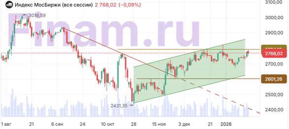 В четверг, 22 января, российский рынок акций взял передышку на фоне ожидания итогов очередного визита в Кремль спецпосланников президента США по вопросам урегулирования конфликта вокруг Украины. В то же время негативное влияние на цены акций оказало новое укрепление рубля. Между тем по данным Росстата, с 13 по 19 января 2026 года инфляция в РФ составила 0,45%, с начала года к 19 января — 1,72%, а годовая инфляция по состоянию на 19 января ускорилась до 6,46% по сравнению с 6,26% на 12 января и 5,59% на начало года. Рубль снова заметно укрепился. Банк России установил на 23 января официальный курс доллара 76,0382 (-1,91%), курс евро – 88,7898 (-2,13%), курс юаня – 10,8646 (-2,22%). Котировки золота повышаются на 0,25% до $4844,20 за унцию. Фьючерсы на нефть марки Brent падают на 1,47% $64,28 за баррель. На этом фоне по итогам дневной сессии Индекс МосБиржи отступил на 0,09% до уровня 2768,02 пункта, в то время как рассчитываемый в долларах индекс РТС вырос до 1146,77 пункта. В составе индексов более слабую динамику показали «Новатэк» (-2,3%), ПИК (-1,54%), ММК (-1,48%), НЛМК (-1,23%) и «Аэрофлот» (-1,15%). В списке лидеров оказались акции «МД Медикал Груп» (+1,51%), «Мосэнерго» (+1,46%), «Интер РАО» (+1,37%), ВК (+1,07%) и «ДОМ.РФ» (+0,68%). Фронтальный рост произошел в акциях энерго генерирующих компаний, кроме «Интер РАО» и «Мосэнерго» подросли бумаги ТГК-2 ао (+2,87%) и ап (+5,43%), ТГК-14 (+8,24%), ТГК-1 (+5,44%), «Юнипро» (+3,98%). С другой стороны, акции «РусГидро» упали на 2,42% после того, как дальневосточный полпред президента РФ Юрий Трутнев заявил, что компания не будет выплачивать дивиденды по итогам 2025 года, средства будут направлены на модернизацию энергомощностей Дальнего Востока. Производитель крепких спиртных напитков КЛВЗ «Кристалл» представил операционные результаты за 2025 г. Продажи продукции в натуральном выражении снизились на 2,22% (г/г) до 2251 тыс. дал. Тем не менее на фоне роста цен и изменения товарной структуры (снижения производства водки и увеличения выпуска ЛВП), выручка компании выросла на 29,17% (г/г) до 4,759 млрд руб. Акции «Кристалла» после публикации результатов выросли на 1,90%. МТС-Банк сообщил, что закрыл сделку по приобретению 99,9% акций АО «ЭКСИ-Банк», который был его ключевым технологическим партнером для запуска флагманской дебетовой карты экосистемы «МТС Деньги». После выхода этой информации акции МТС-Банка снизились на 1,1%. Инвесторам, ориентированным на акции отечественных компаний, мы рекомендуем обратить внимание на стратегию «RU. Капитал и дивиденды». Техническая картина Индекс МосБиржи Индекс МосБиржи остается в восходящем канале. Линия сопротивления проходит чуть выше 2850 пунктов. Линия поддержки расположена выше 2600 пунктов.
