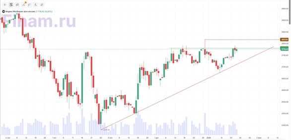 В пятницу, 23 января, рынок завершает основную сессию в «зеленой зоне». Индекс МосБиржи растет на 0,32% до 2776,83 пункта, долларовый индекс РТС увеличивается на 0,47% до 1152,15 пункта. Сегодня в ОАЭ стартовала трехсторонняя встреча России, Украины и США. Комментарии по итогам переговоров ожидаются позднее, в связи с чем инвесторы сохраняют выжидательную позицию на фоне повышенной чувствительности рынка к геополитическим факторам. Банк России снизил официальный курс доллара на 24 января до 75,92 рубля с 76,04 рубля днем ранее. Курс евро увеличен до 89,06 рубля с 88,79 рубля в предыдущий день. По данным ЦБ, профицит торгового баланса России за январь-ноябрь 2025 года снизился на 12,9% — до $106,2 млрд против $121,9 млрд годом ранее, а профицит счета текущих операций сократился на 36,4% и составил $38,1 млрд. Экспорт за отчетный период уменьшился до $375 млрд, импорт — до $268,8 млрд. По данным Центробанка, инфляция в 2025 году замедлилась по сравнению с предыдущим годом в 82 регионах, а в целом по России составила 5,6% против 9,5% годом ранее, достигнув минимальных значений за пять лет в большинстве субъектов. Особенно заметно замедлился рост цен на овощи, фрукты и сахар, а также подешевело топливо, тогда как повышение цен на услуги и непродовольственные товары было умеренным. Лидерами роста фондового рынка сегодня стали «Башнефть» (+5,15%), «М.Видео» (+1,84%), «Ростелеком» (+1,78%), «Норникель» (+1,58%), «Акрон» (+1,47%), «ФосАгро» (+1,32%), «Мосэнерго» (+1,13%). Между тем в минусе финишировали бумаги «Русгидро» (-1,80%), «ОВК» (-1,63%), «Россети» (-1,54%), «Юнипро» (-1,02%). ПАО «ЭЛ5-Энерго» объявил о выкупе обыкновенных акций по цене 0,5653 руб. за акцию для акционеров, не участвовавших или голосовавших против одобрения реорганизации компании. Подробные условия выкупа представлены в информационном письме на сайте эмитента. Акции снижаются на 0,2%. Акционеры Fix Price одобрили консолидацию обыкновенных акций с коэффициентом 1000 к 1: 1000 старых акций будут обменены на одну новую без изменения долей акционеров и размера уставного капитала. Котировки растут на 1,49%. Инвесторам, интересующимся российским рынком акций, мы по традиции рекомендуем обратить внимание на стратегию «RU. Капитал и дивиденды». Техническая картина Индекс МосБиржи Индекс МосБиржи на дневном таймфрейме протестировал зону сопротивления в 2776,5 пункта. При наличии позитивного новостного фона котировки могут обновить локальные максимумы в районе 2817 пунктов. В обратном случае цена может уйти к наклонной линии тренда от 21 октября в районе 2720 пунктов.