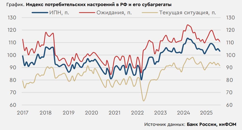 В среду мировые рынки пребывали преимущественно в позитивном настроении. Важных экономических публикаций, способных повлиять на динамику активов, вчера не было, американские индексы отыгрывали поступающие корпоративные новости. Российский рынок закрыл вчерашний день в плюсе, однако в долговых активах присутствовали продажи. Согласно опубликованному вчера полному отчету по опросу инФОМ, индекс потребительских настроений в августе снизился до минимума с декабря. Также в среду вечером Росстат вывел в свет большое количество данных. Так, недельная инфляция в РФ ускорилась до 0,02% против -0,04% н/н неделей ранее, а рост промышленного производства в июле замедлился до 0,7% с июньских 1,9% м/м. Впрочем, эти цифры опубликованы после окончания основной торговой сессии и будут отыгрываться уже сегодня. В четверг центральным событием на мировых рынках станет публикация второй оценки темпа роста ВВП в США. Эти данные могут стать источником повышенной волатильности на рынках в случае большой разницы с предыдущими результатами. Помимо этого, интерес будут представлять недельные цифры по заявкам по безработице в Штатах, а также индекс экономических настроений и инфляционные ожидания потребителей в еврозоне в августе. На рынке РФ инвесторы будут отыгрывать поступающие новости и вчерашнюю статистику от Росстата, локально важных экономических публикаций в четверг не ожидается. Нефть и рубль Котировки Brent вчера росли. В качестве причины можно отметить снижение запасов нефти на складах США по данным Минэнерго, которое превысило ожидания. В настоящий момент фьючерсы торгуются на отметках в $67,7/барр. Сегодня динамика котировок будет зависеть от экономических данных из Штатов. Если они не разочаруют инвесторов, стоимость сырья может сегодня остаться выше отметок в $67/барр. Российский рубль в среду номинально укрепился. Приближение к пику налогового периода поддерживало национальную валюту. В настоящий момент курс CNYRUB торгуется на отметках 11,23 руб./юань. Другие валюты ЕМ с утра преимущественно укрепляются к доллару США. С завтрашнего дня фактор налогового периода сойдет на нет. На этом фоне курс может остаться в коридоре 11,15-11,35 руб./юань. Потребительские настроения в России Вчера ЦБ выпустил полные данные августовского опроса инФОМ, показавшие снижение индекса потребительских настроений россиян с 104,99 п. до 103,16 п., что является минимумом с декабря. Такая динамика обусловлена падением как оценок текущей ситуации, так и ожиданий респондентов. При этом индекс изменения своего материального положения за последний год снизился до наименьших значений с октября 2023 года. Также стоит отметить, что доля респондентов, считающих текущий курс рубля устойчивым, увеличилась до максимумов с февраля 2024 года. Для регулятора это хороший сигнал, поскольку прогнозы устойчивого курса национальной валюты будут способствовать стабилизации инфляционных ожиданий россиян, которые сейчас находятся на высоких отметках.