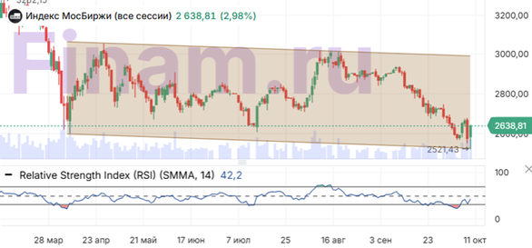 В четверг, 9 октября, падение российских акций было остановлено возобновлением покупок. Похоже, что инвесторы посчитали, что они уже достаточно дешевы для этого. Начав день новым снижением, Индекс МосБиржи развернулся вверх и завершил дневную сессию убедительным ростом по сравнению с фиксингом предыдущего дня. Глава Банка России Эльвира Набиуллина в кулуарах форума «Финополис» заявила журналистам, что решения по ключевой ставке до конца года не предопределены, и что пространство для ее снижения остается. Чем также добавила рынку толику оптимизма. Между тем, по предварительной оценке Минфина, дефицит федерального бюджета РФ за январь-сентябрь 2025 г. составил 3,787 трлн руб. по сравнению с профицитом в 578 млрд руб. за аналогичный период прошлого года. Доходы бюджета за 9 месяцев 2025 г. составили 26,938 трлн руб., что на 2,5% выше объема поступления доходов в соответствующем периоде 2024 г. Расходы составили 30,725 трлн руб., что выше уровня предыдущего года на 19,5%. Недельная инфляция в РФ снова ускорилась. Как показал Росстат, рост потребительских цен на неделе с 30 сентября по 6 октября составил 0,23% после повышения на 0,13% неделей ранее и на 0,08% двумя неделями ранее. Годовая инфляция в РФ по состоянию на 6 октября выросла до 8,1%, по оценке Росстата, а по оценке Минэкономразвития ускорилась до 8,08% с 8,01% неделей ранее. По итогам дня Банк России установил на 10 октября официальный курс доллара 81,4103 (-0,17%), курс евро – 94,7030 (-0,24%), курс юаня – 11,3642 (+0,15%). Котировки золота, обновив максимум, перешли к снижению и теряют 0,40%, отступая до $4025,50 за унцию. Фьючерсы на нефть марки Brent опускаются на 0,30% до $66,04 за баррель. На этом фоне к завершению дневной сессии по состоянию на 18:40 мск Индекс МосБиржи вырос на 2,98% до уровня 2638,81 пункта, в то время как рассчитываемый в долларах индекс РТС поднялся на 3,15% до 1021,10 пункта. «Сбер» раскрыл отчетность по РСБУ за 9 месяцев 2025 г. Чистая прибыль «Сбербанка» в январе-сентябре 2025 года выросла на 6,4% (г/г) и составила 1,27 трлн руб. Обыкновенные акции «Сбера» выросли на 2,65%, обыкновенные повысились на 2,55%. А в лидеры роста в составе индексов по итогам дневной сессии вышли «Норникель» (+6,60%), ЭН+ (+5,60%), «Русал» (+5,34%) и «Татнефть» а.о. (+5,10%) и а.п. (+4,64%). В аутсайдерах дня оказались акции девелопера ПИК СЗ. Сегодня они потеряли 4,09%, продолжив вчерашнее падение после того, как совет директоров рекомендовал отменить дивидендную политику и на неопределенный срок отказаться от распределения прибыли. Также предложено было провести обратный сплит акций из расчета 100 к 1. Акционерам предстоит проголосовать по этим вопросам на общем собрании, которое назначено на 14 ноября. Очевидно, что акции Группы ПИК, которые в этом случае будут стоить около 50 тыс. руб. за штуку, вряд ли будут пользоваться популярностью у розничных инвесторов. Среди других индексных бумаг отрицательную динамику к завершению дневной сессии сохранили «Хэдхантер» (−1,07%), ЮГК (−0,81%), «Полюс» (−0,72%) и «ФосАгро» (−0,29%). Инвесторам, ориентированным на акции отечественных компаний, мы рекомендуем обратить внимание на стратегию «RU. Капитал и дивиденды». Техническая картина Индекс МосБиржи Похоже, что Индекс МосБиржи нашел точку опоры, развернувшись чуть выше значения 2520 пунктов, после чего снова поднялся выше отметки 2600. При этом мы наблюдаем дивергенцию по RSI. Вероятно, здесь сейчас формируется новый уровень 