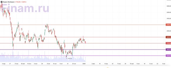 Дополнительным негативным фактором стал дивидендный гэп «ЛУКОЙЛ», закрывшийся 12 января: дивидендный гэп по бумагам компании не был выкуплен даже частично, при этом котировки упали значительно ниже уровня гэпа на фоне сообщений о нанесенных в выходные ударах по буровым установкам «ЛУКОЙЛа» в Каспийском море — атаки на объекты энергосектора усилили опасения инвесторов. В процессе торгов индекс впервые с ноября опустился ниже 2700 п.