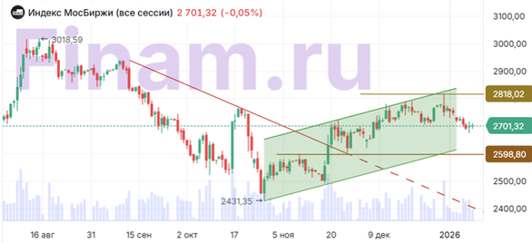 В четверг, 15 января, на фоне противоречивой картины дня российский рынок акций не имел выраженной динамики, а фондовые индексы показали около нулевые изменения. Цены на экспортируемое сырье перешли к коррекции после подъема. Рост инфляции в январе усиливает сомнения в намерениях Банка России в очередной раз снизить ключевую ставку. На геополитической арене снова замаячил умеренный оптимизм после того, как Кремль подтвердил подготовку к новому визиту спецпосланников Дональда Трампа в Москву, хотя его дата пока неизвестна. Кроме того, вечером на церемонии вручения верительных грамот чрезвычайными и полномочными послами иностранных государств Президент РФ Владимир Путин заявил, что мирное урегулирование конфликта на Украине должно быть достигнуто чем скорее, тем лучше, и что Россия готова к восстановлению отношений со странами Европы. В пятницу Росстат опубликует данные по инфляции в декабре и в целом за 2025 г. А за период с 1 по 12 января 2026 г. рост потребительских цен в РФ составил 1,26%. Ускорение инфляции обусловлено отчасти повышением ставки НДС с 20% до 22%, а отчасти ростом цен на продукты питания, которые увеличились на 1,4%, при этом плодоовощная продукция подорожала сразу на 7,88%. По оценке Минэкономразвития, годовая инфляция в РФ по состоянию на 12 января ускорилась до 6,27% с 5,98% на 22 декабря. Между тем, по данным ФТС, положительное внешнеторговое сальдо РФ в январе-ноябре 2025 г. снизилось на 10,5% (г/г) и составило $124,7 млрд. Экспорт в годовом выражении сократился на 5,3% — до $373,7 млрд, импорт уменьшился на 2,4%, до $249,0 млрд. Банк России установил на 16 января официальный курс доллара 78,5280 (-0,05%), курс евро – 91,8123 (-0,42%), курс юаня – 11,2402 (-0,02%). Котировки золота отступают на 0,28% до $413,50 за унцию. Фьючерсы на нефть марки Brent падают на 4,57% до $63,48 за баррель после того, как Дональд Трамп дал понять, что может пока воздержаться от проведения силовой операции в Иране. Кроме того, Трамп заявил в среду, что пока решил не вводить пошлины на редкоземельные элементы, литий и другие критически важные минералы и вместо этого поручил своей администрации искать поставщиков среди международных торговых партнеров. Это прервало ралли в металлах, которые теряют от 1% до 2,7%. На этом фоне по итогам дневной сессии Индекс МосБиржи отступил на 0,05% до уровня 2701,32 пункта, в то время как рассчитываемый в долларах индекс РТС остался почти без изменений на уровне 1083,66 пункта. На фоне падения цен на металлы отрицательную динамику показали акции «Селигдара» (-1,40%), «Русала» (-1,39%), «Норникеля» (-0,98%), ЮГК (−0,69%). В списке растущих индексных бумаг лидируют акции «Мосэнерго» (+5,60%) после того, как совет директоров компании рекомендовал дивиденды за 2024 г. в размере около 0,226 руб. за акцию. Текущая дивидендная доходность составляет около 9,8%. Также лучше рынка завершили дневную сессию бумаги «Интер РАО» (+3,38%), Группы «Позитив» (+1,52%), ММК (+1,27%), МКБ (+1,25%), «МД Медикал Груп» (+1,23%) и «Северстали (+1,19%). Компания «ЕвроТранс», владелец сети АЗС «Трасса», представила предварительные финансовые результаты за 2025 г. Выручка превысила 250 млрд руб., рост на 34,3% (г/г). EBITDA превысила 24 млрд руб., рост на 42,0% (г/г). Акции компании подскочили на 5,30%. Из других корпоративных новостей. Совет директоров «Фармсинтеза» (-0,78%) рекомендовал не выплачивать дивиденды за 2024 г. и предложил акционерам увеличить УК путем размещения 1,1 млрд а