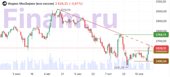 В четверг, 20 ноября, российский рынок акций корректируется после бурного роста накануне, снижая ожидания относительно сроков мирного урегулирования. СМИ продолжают обсуждать инсайд с 28 пунктами мирного соглашения, однако ни официальный Киев, ни официальная Москва, ни даже официальный Вашингтон не подтвердили согласия с этим списком. Сегодня Госдума приняла в третьем чтении Федеральный бюджет РФ на 2026-2028 гг. Основные параметры бюджета на 2026 г. рассчитаны, исходя из прогнозного объема ВВП в 235,067 трлн руб. и инфляции не выше 4%. Доходы федерального бюджета в 2026 г. составят 40 трлн 283,269 млрд руб., расходы – 44 трлн 069,704 млрд руб. Дефицит – 3 трлн 786,435 млрд руб. (1,6% ВВП). Одновременно законодатели приняли закон о повышении с 2026 г. НДС до 22%. Между тем, по данным Росстата, рост потребительских цен на неделе с 11 по 17 ноября составил 0,11% после роста на 0,09% в период с 6 по 10 ноября и роста на 0,11% в период с 28 октября по 5 ноября. Годовая инфляция в РФ по состоянию на 17 ноября замедлилась до 7,2% против 7,37% на 10 ноября 2025 г. Рубль снова укрепился. По итогам дня Банк России установил на 21 ноября официальный курс доллара 80,7321 (-0,26%), курс евро – 92,6047 (-1,25%), курс юаня – 11,2795 (-0,56%). Котировки золота стабилизировались в районе $4080,40 за унцию. Фьючерсы на нефть марки Brent повышаются на 1,04% до $64,18 за баррель. На этом фоне по итогам дневной сессии Индекс МосБиржи опустился на 0,67% до уровня 2628,31 пункта, в то время как рассчитываемый в долларах индекс РТС отступил на 0,41% до 1025,58 пункта. Более слабую динамику в составе индексов показали акции «ФосАгро» (−1,65%), «Мосэнерго» (−1,58%), «Сургутнефтегаза» ао (−1,57%), «Алросы» (−1,56%) и «Северстали» (−1,20%). Среди лидеров роста оказались бумаги «ПИК СЗ» (+1,80%), «Хэдхантера» (+1,50%), «Транснефти» ап (+1,36%), МКБ (+1,35%) и НЛМК (+1,30%). Размещение акций «Дом.РФ» в рамках IPO прошло по верхней границе на уровне 1750 руб. за бумагу. Капитализация «Дом.РФ» по итогам IPO составила около 315 млрд руб. В первый день торгов цена акций осталась вблизи цены размещения. «Мечел» объявил операционные результаты за III квартал и 9 месяцев 2025 г. Добыча угля в январе-сентябре сократилась в годовом сопоставлении на 38%, производство чугуна снизилось на 5%, выплавка стали – на 2%. Обыкновенные акции «Мечела» упали на 1,91%, привилегированные снизились на 0,89%. У «Т-Технологии» (-0,34%) вышла отчетность по МСФО за III квартал и 9 месяцев 2025 г. Выручка по итогам 9 месяцев превысила 1 трлн руб. (+69% (г/г)), чистая прибыль составила 120,1 млрд руб. (+43% (г/г)). Кроме того, компания запустила buyback в размере до 5% текущего уставного капитала и сроком до 31 декабря 2026 г., а совет директоров рекомендовал дивиденды за 3 квартал 2025 г. в размере 36 руб. на акцию (доходность около 1,2%). Выручка ВК (-0,04%) по МСФО за 9 месяцев 2025 г. составила 111,3 млрд руб., что на 10% выше показателя за аналогичный период прошлого года. Также сегодня финансовую отчетность опубликовали «Ренессанс Страхование» (-1,08%), «Арендата» (-0,43%) и «Софтлайн» (-1,93%). Инвесторам, ориентированным на акции отечественных компаний, мы рекомендуем обратить внимание на стратегию «RU. Капитал и дивиденды». Техническая картина Индекс МосБиржи Индекс МосБиржи встретил сопротивление в районе 2670 пунктов. Следующее расположено около 2760. Ближайшая поддержка находится на 2600, следующая – около 2500 пунктов.