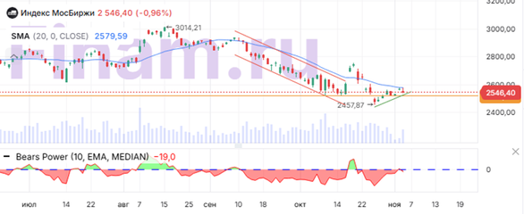 Вечером в среду российский рынок акций резко развернулся вниз после новостей о возможности скорого начала ядерных испытаний. Индекс МосБиржи упал на 1,0% — до 2546 пунктов, сменив сдержанную консолидацию в узком диапазоне на быструю коррекцию. В первой половине дня рынок сохранял умеренный оптимизм и дрейфовал чуть выше 2570 пунктов, однако геополитический негатив быстро переломил внутридневной настрой. Триггером выступили заявления министра обороны РФ Андрея Белоусова о предложении немедленно приступить к подготовке к ядерным испытаниям в ответ на слова президента США Дональда Трампа о возможном выходе из моратория. Президент Владимир Путин поручил МИД, Минобороны, спецслужбам и гражданским ведомствам собрать дополнительную информацию и выработать согласованные предложения по дальнейшим шагам. В лидерах роста сегодня оказались акции «Вуш Холдинга» (+6,22%), ПИК (+2,64%), «Позитива» (+2,11%), ВТБ (+0,82%), «Абрау-Дюрсо» (+0,77%), «Ростелекома» (+0,71%), «Транснефти» ап (+0,71%), «Системы» (+0,60%), «Распадской» (+0,18%), ВК (+0,15%). Хуже рынка выглядели бумаги ОГК-2 (-16,49%), МКБ (-2,98%), «Юнипро» (-2,20%), «Эн+ Груп» (-2,11%), «РуссНефти» (-2,09%), «Лукойла» (-1,96%), «Соллерс» (-1,93%), «Башнефти» (-1,87%), «Норникеля» (-1,53%), СПБ Биржи (-1,47%). Объемы торгов оставались относительно невысокими, что подтверждает выжидательную позицию игроков перед новыми макроэкономическими публикациями и корпоративными событиями. Из корпоративных новостей выделилось решение «Европлана» о дивидендах с доходностью свыше 10%, а также ожидание рекомендаций по дивидендам в НКХП. Технический анализ Индекс МосБиржи Индекс МосБиржи движется в краткосрочном восходящем тренде, давление продавцов снизилось. В ближайшей перспективе наиболее вероятен сценарий консолидации в диапазоне 2520-2700 до появления новых сильных рыночных драйверов. Для формирования устойчивого «бычьего» сигнала необходим пробой и закрепление выше линии 20-дневной SMA, которая проходит сейчас на уровне 2580, и рост объемов торгов.