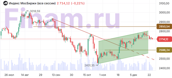 В четверг, 25 декабря, российский рынок акций показал неуверенную картину в отсутствие геополитических событий и внешних сигналов, в то время как фондовые площадки Америки, Европы и значительной части Азии были закрыты в связи с празднованием Рождества по григорианскому календарю. Ключевые товарные рынки также не работают сегодня. Недельная инфляция в РФ показала ускорение перед новогодними праздниками. По данным Росстата, рост потребительских цен на неделе с 16 по 22 декабря составила 0,20% после роста на 0,05% неделей ранее и роста на 0,05 двумя неделями ранее. Тем не менее, годовая инфляция по состоянию на 22 декабря, по оценке Росстата, замедлилась до 5,65% по сравнению с оценкой неделей ранее 5,8%. По оценке Минэкономразвития, годовая инфляция в России с 16 по 22 декабря составила 5,98% против 6,08% на 15 декабря. Также Росстат опубликовал производственную статистику за 11 месяцев 2025 г. Как оказалось, в ноябре был зафиксирован спад промышленного производства: показатель снизился на 0,7% в годовом выражении и на 4,1% по сравнению с октябрем. В целом за период с января по ноябрь промышленное производство в России увеличилось на 0,8% (г/г), в основном за счет производств, связанных с высокими технологиями и оборонно-промышленным комплексом. Сальдированная прибыль предприятий РФ в январе-октябре сократилась на 9,9% (г/г) до 21 трлн 566,0 млрд руб. В том числе в октябре сальдированная прибыль предприятий составила 2 трлн 344,5 млрд рублей, упав на 24,7% относительно октября 2024 г. Между тем, российский рубль снова заметно укрепился. Банк России установил на 26 декабря официальный курс доллара 77,8844 (-0,70%), курс евро – 91,8902 (-0,63%), курс юаня – 11,0773 (-0,94%). На этом фоне по итогам дневной сессии Индекс МосБиржи опустился на 0,22% до уровня 2714,12 пункта, в то время как рассчитываемый в долларах индекс РТС повысился на 0,49% до 1097,79 пункта. В составе индексов в минусе завершили сессию большинство акций. Худшую динамику показали бумаги «Мосэнерго» (-2,51%), МКБ (-2,08%), «ИнтерРАО» (-1,81%), ПИК СЗ (-1,69%) и «Аэрофлот» (-1,64%). В плюсе к завершению основной сессии оказались акции «ФосАгро» (+3,05%), «Озона» (+2,54%), ВК (+0,73%), ЮГК (+0,70%) и «ИКС 5» (+0,54%). Акции «Мечела» неожиданно развернулись к росту после того, как директор финансового управления компании Александр Овчинников рассказал журналистам, что «Мечел» в результате договоренностей с банками-кредиторами смог снизить нагрузку на денежный поток в 2025-2026 гг. на сумму порядка 132 млрд руб. Помимо переноса погашения «тела» долга на 2027-2030 гг., изменения «предусматривают уплату процентов по сниженной ставке с августа 2025 г. по январь 2027 г. На этой информации обыкновенные и привилегированные акции «Мечела» прибавили по 1,31%. Из других корпоративных новостей, гендиректор «Аэрофлота» (-1,64%) Сергей Александровский на встрече с премьер-министром РФ Михаилом Мишустиным поделился планами Группы «Аэрофлот» перевезти в 2025 г. около 55,4 млн пассажиров, т.е. чуть больше, чем в 2024 г. (55,3 млн). Акции «Абрау-Дюрсо» в моменте подскакивали почти на 10% на фоне заявлений бенефициара компании Бориса Титова, что он не исключает выплату дивидендов по итогам 2025 г. Однако по итогам дня акции «Абрау-Дюрсо» снизили темп и завершили основную сессию ростом на 3,58%. Акции «ЭсЭфАй» предсказуемо рухнули на 48,26% в связи с отсечкой на рекордные дивиденды в размере 902 руб. на акцию. Дивидендная доходность по отсечке