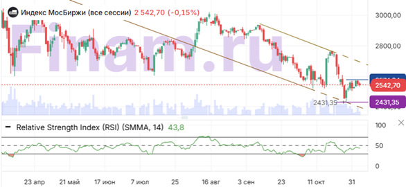 В четверг, 6 ноября, российский рынок акций показывает слабо отрицательную динамику. Негативная реакция рынка на «ядерную» риторику оказалась показательной, но не очень сильной. И, вероятно, будет непродолжительной, если курс на возобновление ядерных испытаний остается в области риторики и не перейдет в сферу практической реализации. Между тем, согласно исследованию S&P Global, индекс деловой активности (PMI) в сфере услуг РФ в октябре 2025 года вырос до 51,7 пункта против 47 пунктов в предыдущем месяце. Значение выше 50 пунктов указывает на рост деловой активности, а ниже этого уровня ― на ее спад. Композитный PMI также вышел в зону роста, поднявшись в октябре до 50,2 пункта по сравнению с 46,6 пункта в сентябре, несмотря на то что опубликованный ранее PMI обрабатывающих отраслей РФ опустился до 48 пунктов, с сентябрьских 48,2 пункта. По итогам дня Банк России установил на 7 ноября официальный курс доллара 81,3765 (+0,23%), курс евро ― 93,7641 (+0,27%), курс юаня ― 11,3674 (+0,28%). Котировки золота стабилизировались в районе $3981 за унцию. Фьючерсы на нефть марки Brent снижаются на 0,87% до $62,96 за баррель. По итогам дневной сессии Индекс МосБиржи отступил на 0,15% до уровня 2542,70 пункта, в то время как рассчитываемый в долларах индекс РТС опустился на 0,38% до 984,32 пункта. Большая часть бумаг, входящих в индексы, переместилась в отрицательную часть таблицы. В лидерах снижения в составе индексов оказались бумаги «Хэдхантера» (-1,47%), «Татнефти» ао (-1,24%), ВК (-1,23%), МКБ (-1,14%) и «Лукойла» (-0,98%). Положительную динамику удалось сохранить акциям «ИКС 5» (+1,05%), ЮГК (+0,89%), «Совкомфлота» (+0,71%), «Ростелекома» ао (+0,34%) и «Газпрома» (+0,25%). Из корпоративных новостей: «Русал» (-0,85%) по требованию своего акционера ― компании «СУАЛ» назначил на 3 декабря общее собрание акционеров по вопросу дивидендов за 9 месяцев 2025 года. Совет директоров выдал рекомендацию дивиденды не выплачивать. Совет директоров компании «Диасофт» (-0,69%) утвердил новую редакцию Положения о дивидендной политике. Согласно документу, компания будет стремиться выплачивать дивиденды не реже одного раза в полгода при наличии достаточной чистой прибыли по РСБУ. В этом случае на дивиденды будет распределяться не менее 80% от значения показателя EBITDAC по итогам отчетного периода, рассчитываемого на основании консолидированной отчетности. Рекомендацию по дивидендам за 9 месяцев 2025 года совет директоров «Диасофта» примет завтра, 7 ноября. Инвесторам, ориентированным на акции отечественных компаний, мы рекомендуем обратить внимание на стратегию «RU. Капитал и дивиденды». Технический анализ Индекс МосБиржи Индекс МосБиржи обозначил локальный уровень поддержки в районе 2430 пунктов. Вблизи значения 2575 Индекс встретил локальное сопротивление. Если его удастся сломать, откроется путь в сторону 2700. Если не получится, то вероятно сползание индекса до 2400 пунктов.