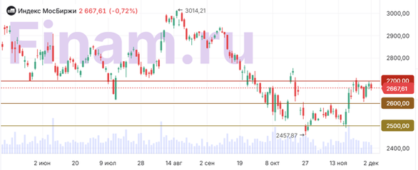 Российский рынок акций во вторник, 2 декабря, завершил торги умеренным снижением, оставаясь под давлением вопреки потенциально позитивным новостям. Сообщения о прибытии в Москву спецпосланника США Стива Уиткоффа для обсуждения урегулирования ситуации на Украине не смогли поддержать настроения инвесторов, которые уже сдержанно реагируют на дипломатические сигналы и не ожидают быстрых результатов. Кроме того, заявления председателя Комитета Госдумы по финансовому рынку Анатолия Аксакова на форуме «Россия зовет» о возможном снижении Банком России ключевой ставки минимум на 0,5% в декабре были восприняты без особого оптимизма. Дополнительную осторожность на рынке вызвали и комментарии Президента РФ Владимира Путина, в которых он отметил, что Россия не рассматривает возможность конфликта с Европой, но при необходимости готова оперативно реагировать на возможные угрозы. По итогам сессии Индекс МосБиржи снизился на 0,69% и составил 2668,4 пункта, а долларовый индекс РТС вырос на 0,41% и достиг уровня 1084,8 пункта. Лидерами роста стали: «Росcети Центр» (+2,94%), «Росcети» (+1,79%), «Россети Ленэнерго» ап (+1,36%), Ozon (+1,32%), «Вуш Холдинг» (+1,23%), НМТП (+1,00%), МТС (+0,93%), «Абрау-Дюрсо» (+0,38%), «Магнит» (+0,38%) и «Татнефть» (+0,24%). В красной зоне оказались бумаги ММК (-1,71%), «Совкомфлота» (-1,50%), СПБ Биржи (-1,47%), «НоваБев» (-1,44%), НЛМК (-1,35%), МКБ (-1,19%), «Соллерса» (-1,17%), «Мечела» ап (-1,16%), «Мосэнерго» (-1,10%) и «Распадской» (-1,09%). Московская биржа объявила о начале торгов акциями «Глоракс» со 2 декабря 2025 года. Инструмент будет доступен инвесторам на утренней и вечерней сессиях фондового рынка. Общее количество инструментов на утренней торговой сессии увеличится до 333, а на вечерней ― до 3193. IPO «Глоракса» состоялось на Московской бирже в конце октября. С 31 октября 2025 года акции были допущены к основной торговой сессии и включены в котировальный список второго уровня. В ходе первичного размещения компания привлекла более 2 млрд руб. Рыночная капитализация по итогам IPO составила около 18 млрд руб., доля акций в свободном обращении (free-float) оценивается примерно в 11%. Инвесторам, интересующимся российским рынком акций, мы по традиции рекомендуем обратить внимание на стратегию «RU. Капитал и дивиденды». Технический анализ Индекс МосБиржи Индекс МосБиржи находится на уровне 2667,6 пункта. При дальнейшем улучшении рыночной конъюнктуры сохраняется потенциал для пробоя сопротивления в районе 2700 пунктов. Однако в случае отсутствия прогресса в переговорах по урегулированию ситуации на Украине индекс может откатиться сначала к отметке 2600 пунктов, а затем и к 2500 пунктам.